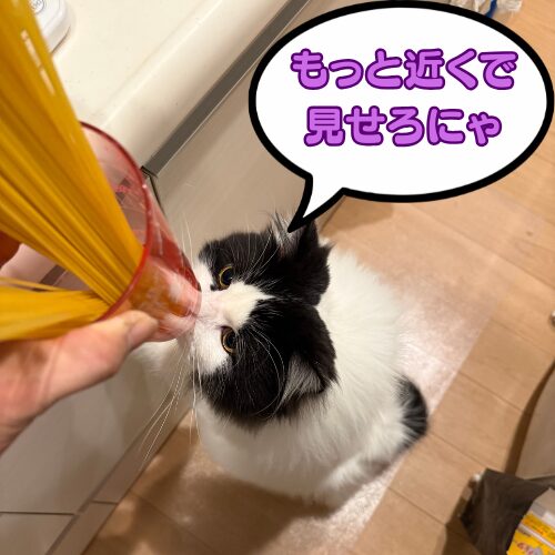 乾麺を袋から出した瞬間、音を聞きつけて走ってキッチンに来るオレオ。