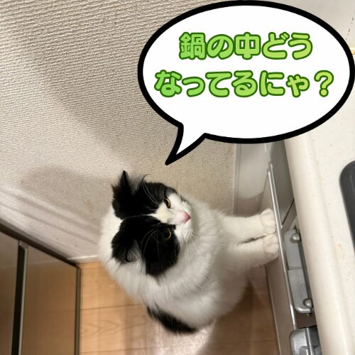 パスタを取り出すと「じーっ」とパスタを見つめ、計量器で測っているときも「じーっ」と見つめ、鍋に入れるときも「じーっ」と見つめ、茹でている時は鍋を「じーっ」と見つめる。