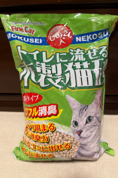 猫砂はおしっこで固まってトイレに流せるタイプ。